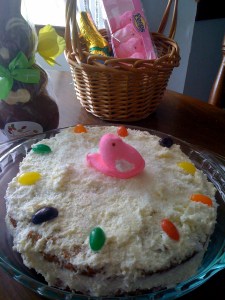 This year I found a recipe online for carrot coconut cake. It was originally published in the 80s in the New York Times. That’s it in the photo above, decorated with jelly beans, and, of course, a pink Peep. It has whipped cream with shredded coconut folded in. I had fun making the cake on Saturday, but to be honest, I didn’t love the results and am not posting the recipe here.