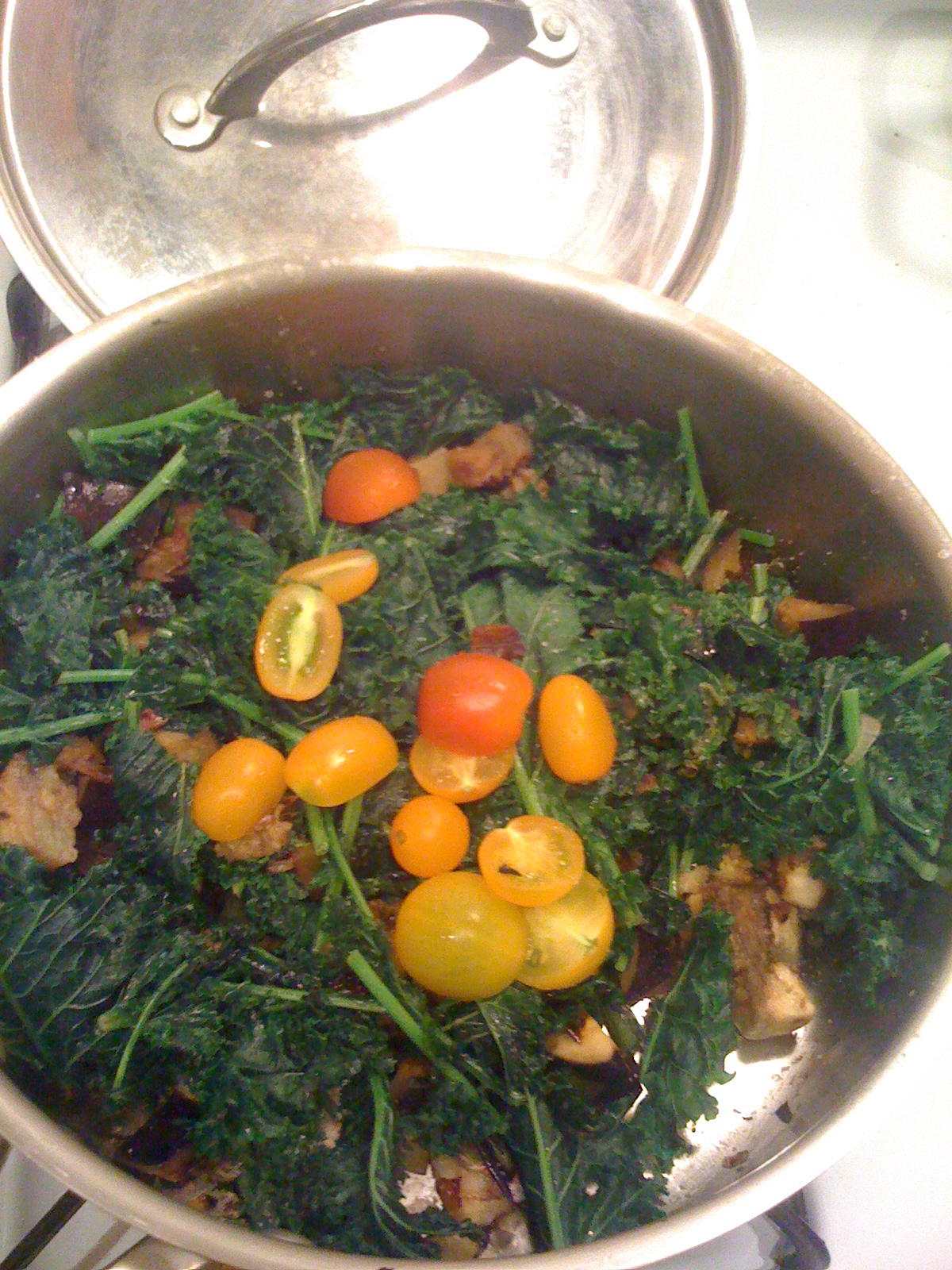 Once the kale had wilted I added 1 cup of the cherry tomatoes, sliced in half, and turned the heat off. I didn’t need for the tomatoes to cook, just to get a little squishy and warm, which they did beautifully. I then drained the pasta and added it to the pan of veggies. The pièce de résistance was 4 tbsp of leftover homemade basil pesto stirred in at the end for a little kick.