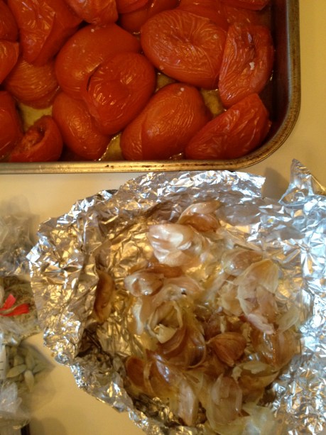Put the garlic cloves on a sheet of aluminum foil and drizzle with olive oil. Wrap the foil. Put the tomatoes in a baking dish, and if using fresh tomatoes, cut them in half and put them cut side down in the dish. Season with salt and drizzle with olive oil. Roast the garlic and tomatoes until soft, fragrant, and brown, about 20 minutes.