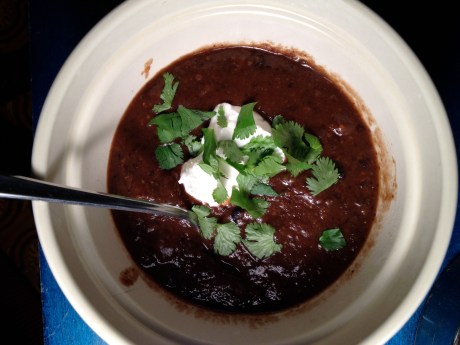 Let the soup cool slightly, then transfer about half to a blender and blend until smooth. Return the soup to the pot and stir to combine. Season to taste. Serve the soup garnished with sour cream, avocado, and cilantro. Corn bread would make a nice side dish.