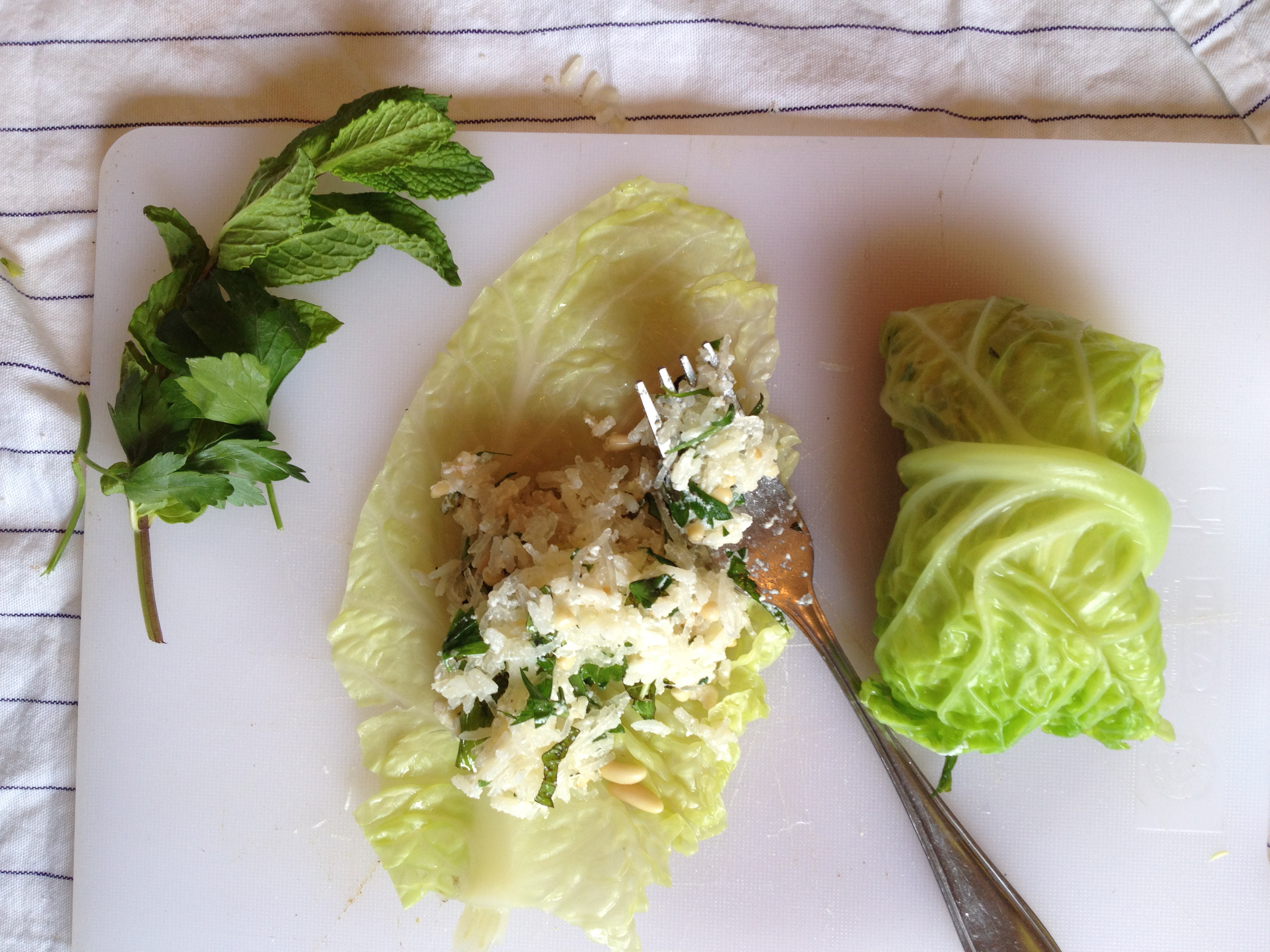 Preheat the oven to 350 F. Add the pine nuts, ricotta, half the Parmesan, the herbs, garlic, salt and pepper, to the cooked rice. Mix well with a fork. Use the cooked cabbage leaves to make parcels of whatever size you’d like, filling each one with a generous amount of the rice filling.