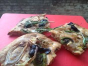 So I bought some Kalamata olives, rosemary, and shallots and set out to make the dough. This recipe requires a bit of time because you have to let the dough rise twice—the first time for at least an hour and a half, the second time for about forty-five minutes. So it’s a good thing to make on a lazy weekend when you can fiddle around in your kitchen, then go do something else for a while, then come back, then do it again. I was pleased with the results — turns out fiddleheads work well with the flavors of rosemary and olives. The bread is salty, crunchy, and let’s face it, rather pretty and springy, no?