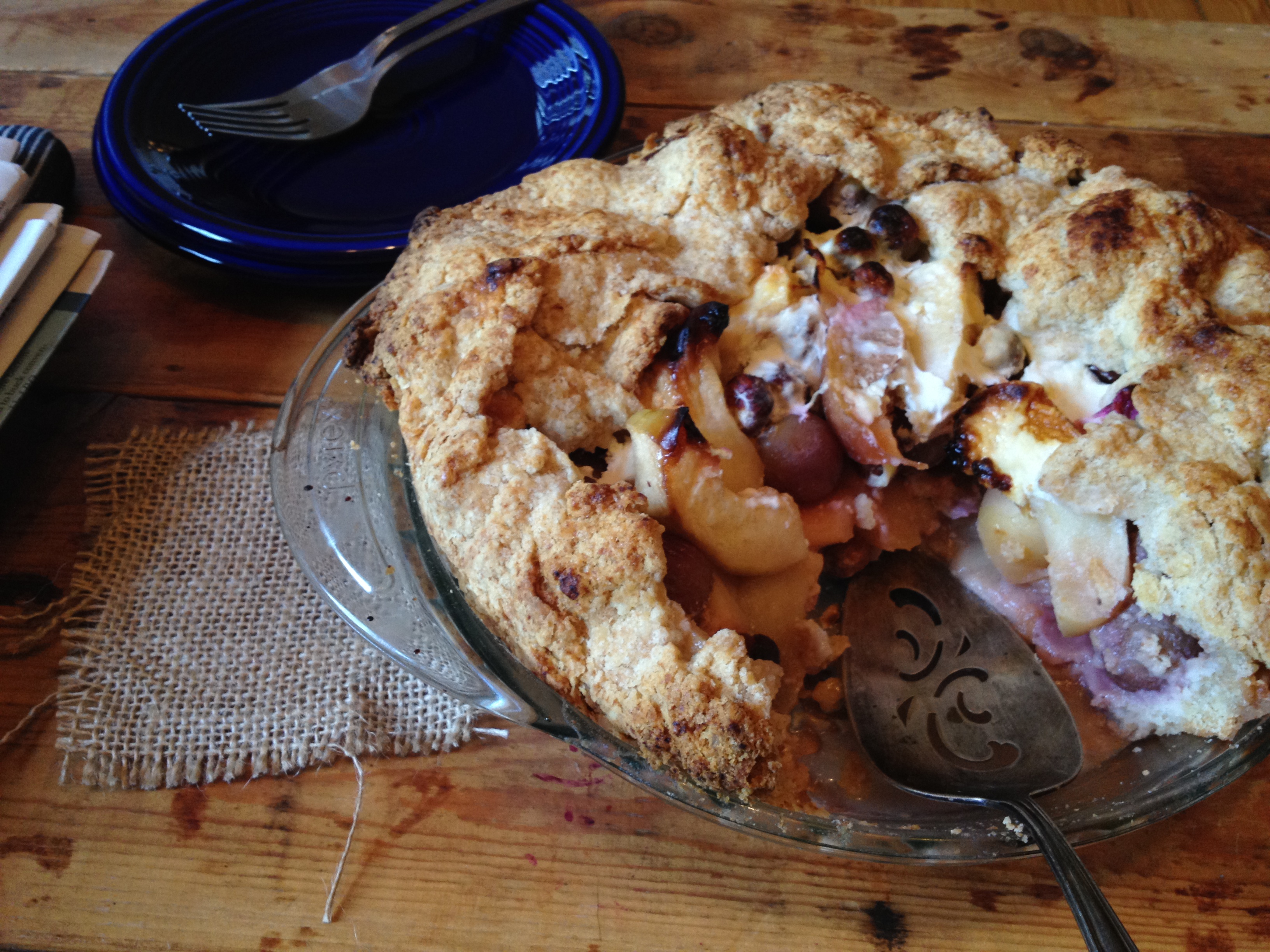 6. Put the tart on a baking sheet and bake at 425 F for one hour, until the top of the dough is browned and the fruit is thoroughly cooked. You can test by placing a knife in the fruit and making sure it goes right through. If, before the hour is up, the crust starts to turn dark brown you can tent with foil about halfway through.