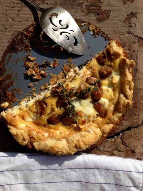 To assemble the tart, break up both types of goat’s cheeses into pieces and scatter in the pastry. Spoon the garlic cloves and syrup evenly over the cheese. In a jug or bowl whisk together the eggs, creams, 1/2 tsp salt and freshly ground black pepper. Pour this over the tart filling to fill the gaps, but make sure you can still see the garlic over the surface.