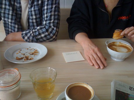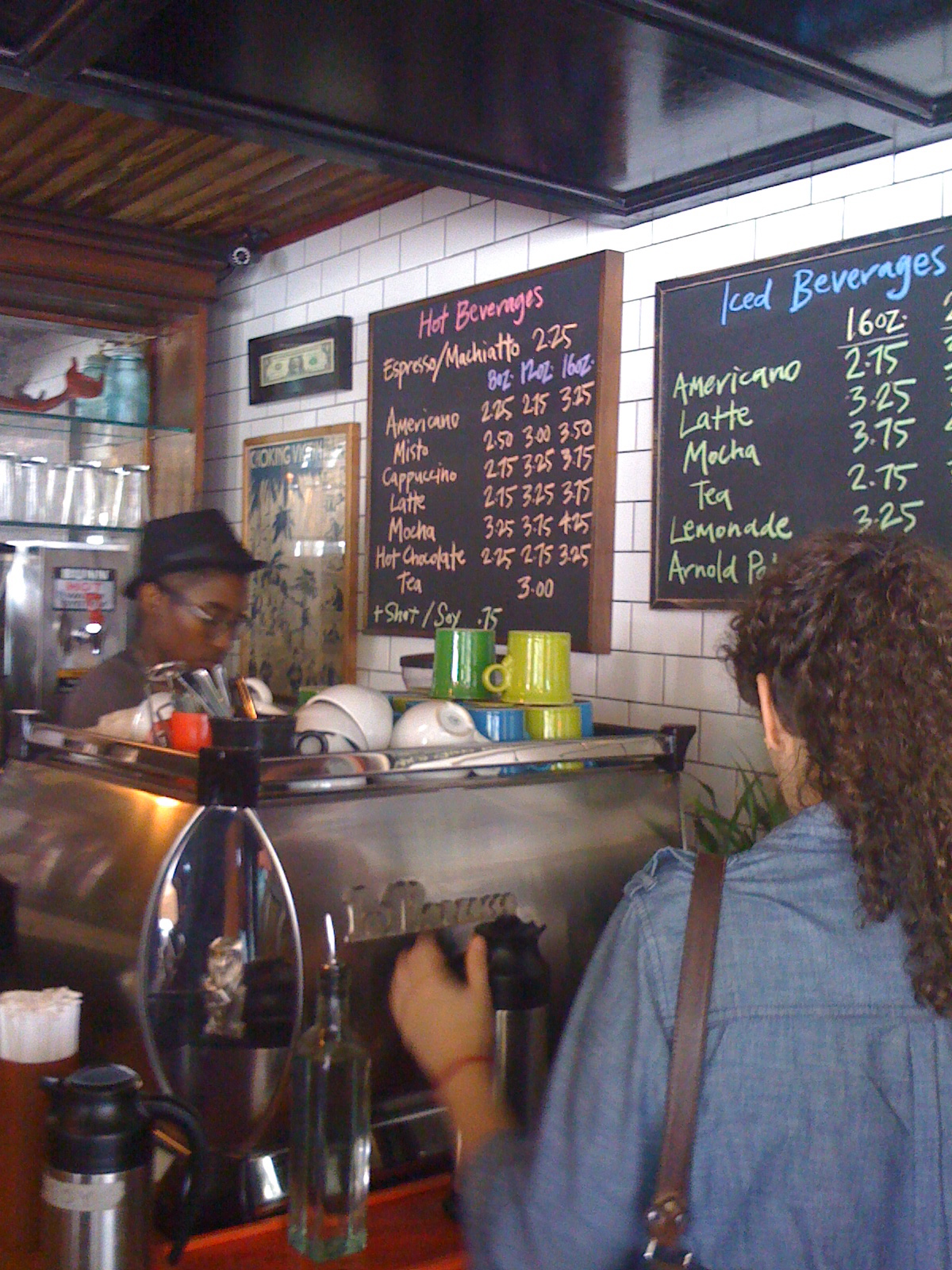 Now the photo up top is not in fact from a hot chocolate quest, but is from this morning’s field trip with a few new friends in my neighborhood. This is Bedford Hill Coffee Bar, on Franklin Ave. in Bed-Stuy, home of delicious americanos and pastries. And below, well that would have to be Dough now wouldn’t it? Just up the street from Bedford Hill, Dough makes delectable yeast donuts with wacky flavors like passionfruit with cacao nibs, dulce de leche with toasted almonds, and a bright pink hibiscus donut. Today I opted for passionfruit.