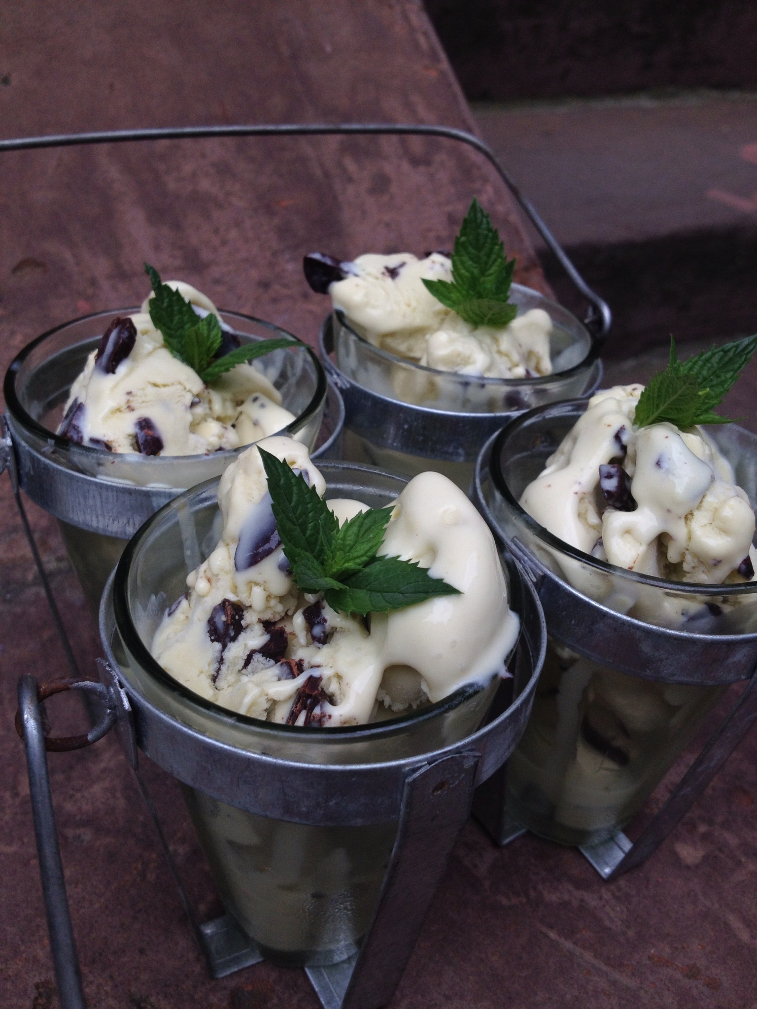 One of the things I love about this recipe is it uses only fresh mint, not mint extract. You infuse the milk and cream with just-picked mint and before freezing add chopped bits of chocolate.