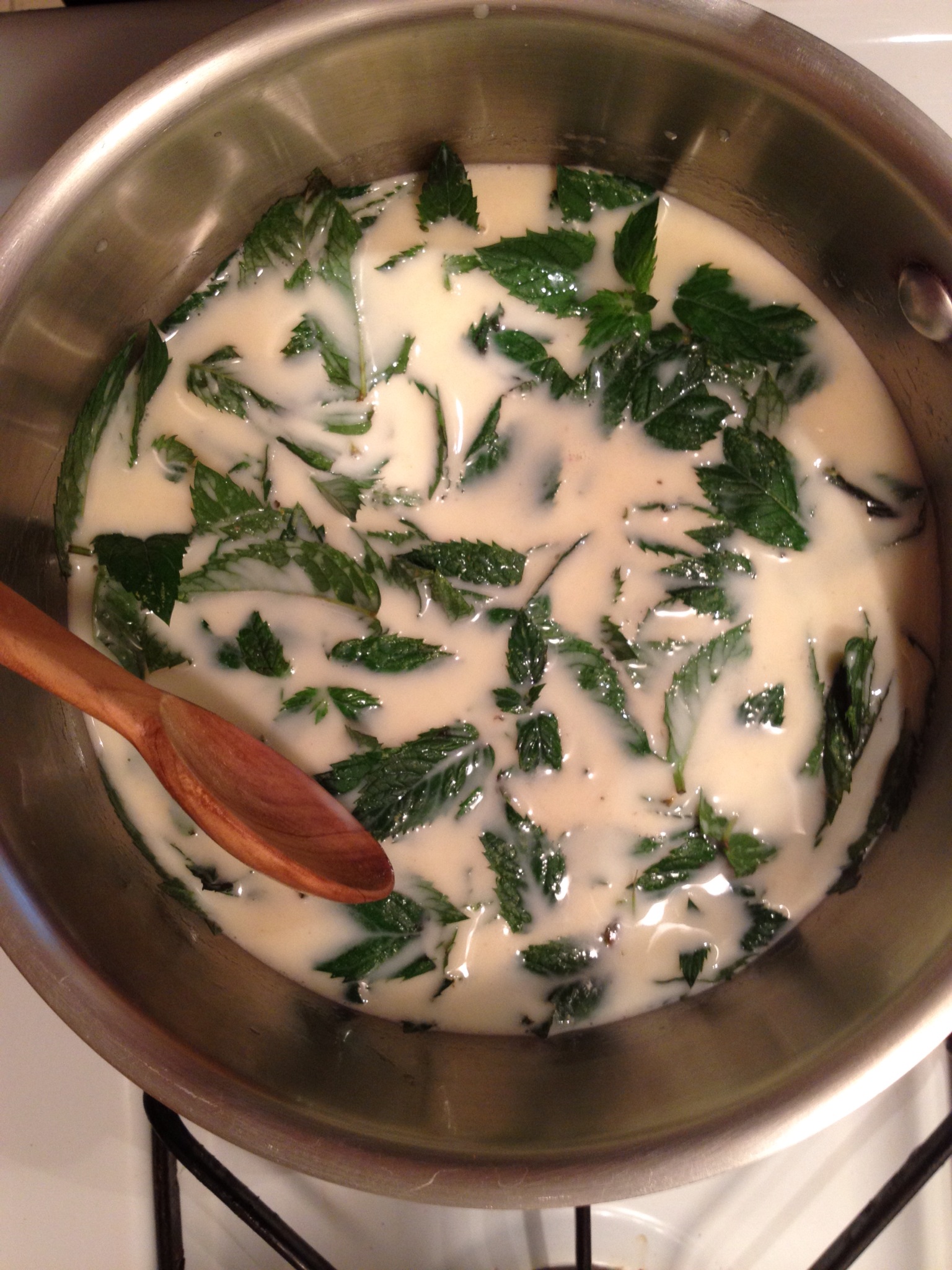 1. In a medium saucepan warm the milk, sugar, 1 c of cream, salt, and mint. Let it get hot and steamy, then remove from heat, cover, and let sit for one hour so the mint infuses the liquid.