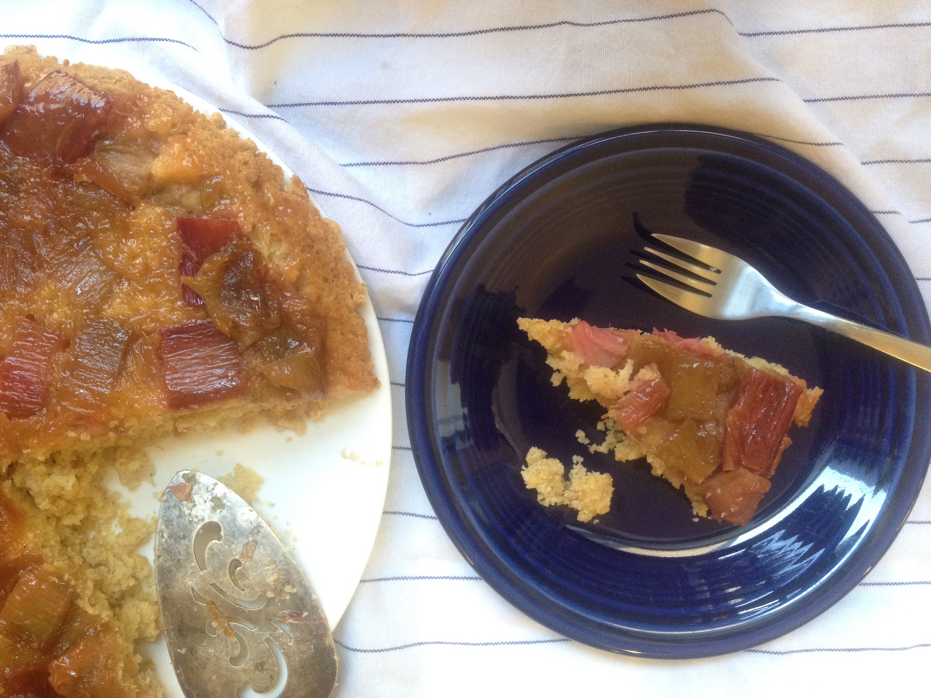 Two Junes ago I made a strawberry rhubarb pie and last year it was a rhubarb crumb cake. This year I was thinking more along the lines of caramelizing the stalks and pairing with ginger. I managed the former but forgot all about the latter. (I blame that on the fact I was baking while trying to watch the men’s French Open final.) I ended up with an upside-down cake—you melt butter and sugar in a cast-iron skillet then add the rhubarb, caramelizing the pieces and adding a flour mixture on top.