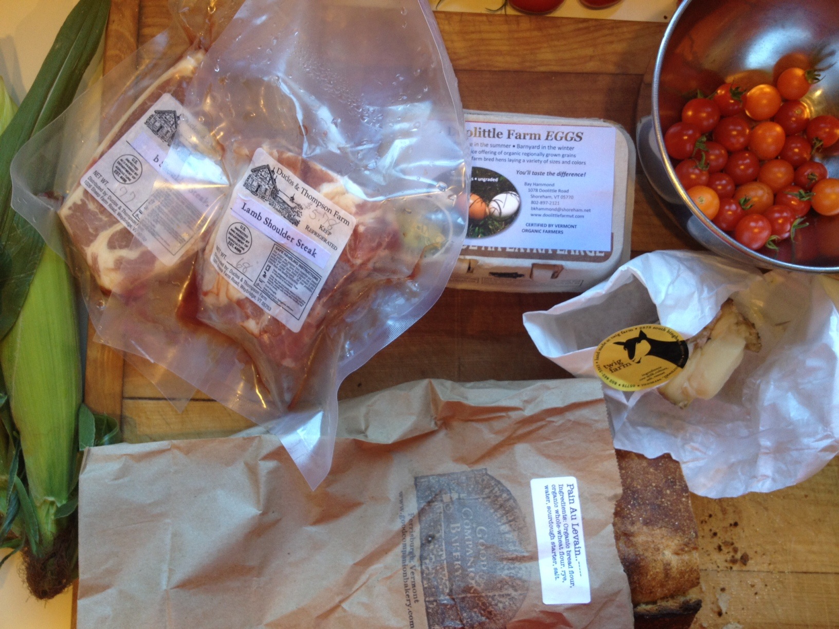 My last errand in town yesterday was to pick up lamb for the skewers from a sheep farm, outside of town, down a dirt road. Kate tipped me off to the farm, and its honor system — you walk into a little room filled with glass-fronted freezers, write down what you’re taking, leave cash in a little plastic cup, and you’re done. I found the farm, which is completely unmarked, no signage, and pulled into the driveway. There was an old farm house on the property, and a few sheds. I wondered if I was in the right place. I heard voices and laughter coming from one of the sheds, and made my way over. The door opened as two people were on their way out, and I asked if I was in the right place to buy lamb. Tom, the farmer, said I was and invited me in. He explained how the system worked. He didn’t have boneless leg of lamb so he walked me through his other cuts. In the meantime we got to chatting, and I mentioned I was up from Brooklyn, but that my parents lived nearby.