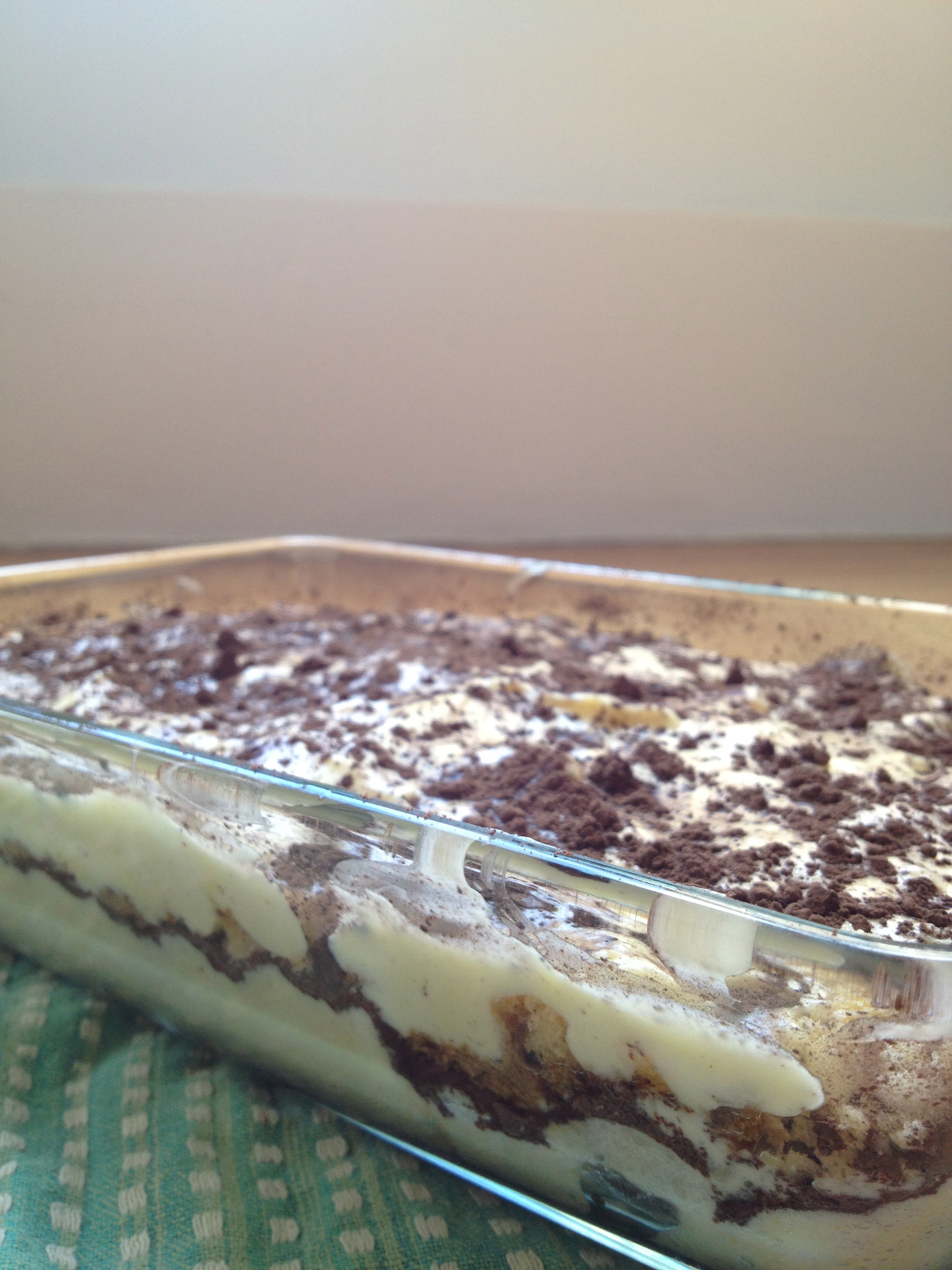 I made tiramisu back in March for my birthday with the very simple, straightforward recipe from The Silver Spoon. (Ingredients: eggs, sugar, mascarpone, lady fingers, coffee, chocolate. That’s it.) I liked it but found the lady fingers weren’t spongy enough, it was a little too sweet, and it lacked the taste of a liqueur like rum or cognac. I rarely have liqueur in my kitchen so I used vanilla extract which isn’t quite the same but was an improvement. I’ve tweaked the recipe here and am pleased with the results.