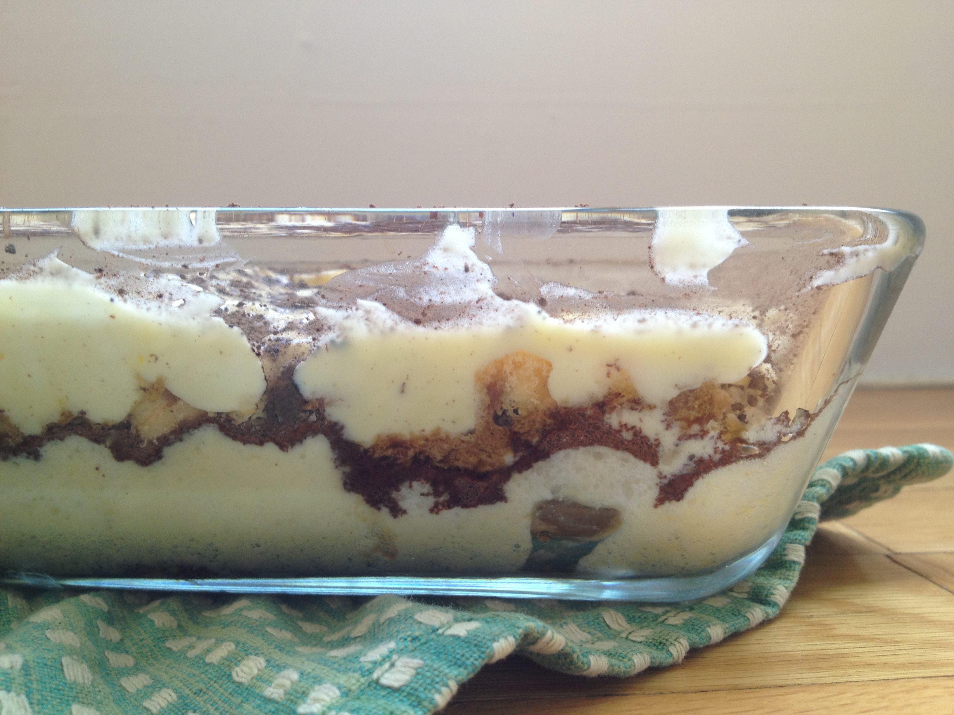 I love tiramisu. Made of mostly mascarpone and eggs it’s light and satisfying and surprisingly easy to make. The strong coffee gives it its name, which means “pick-me-up” in Italian. I got a craving yesterday so I biked to the Park Slope Food Coop where Vermont Creamery mascarpone is only $3 for an 8-ounce container (you need two of those for this recipe).