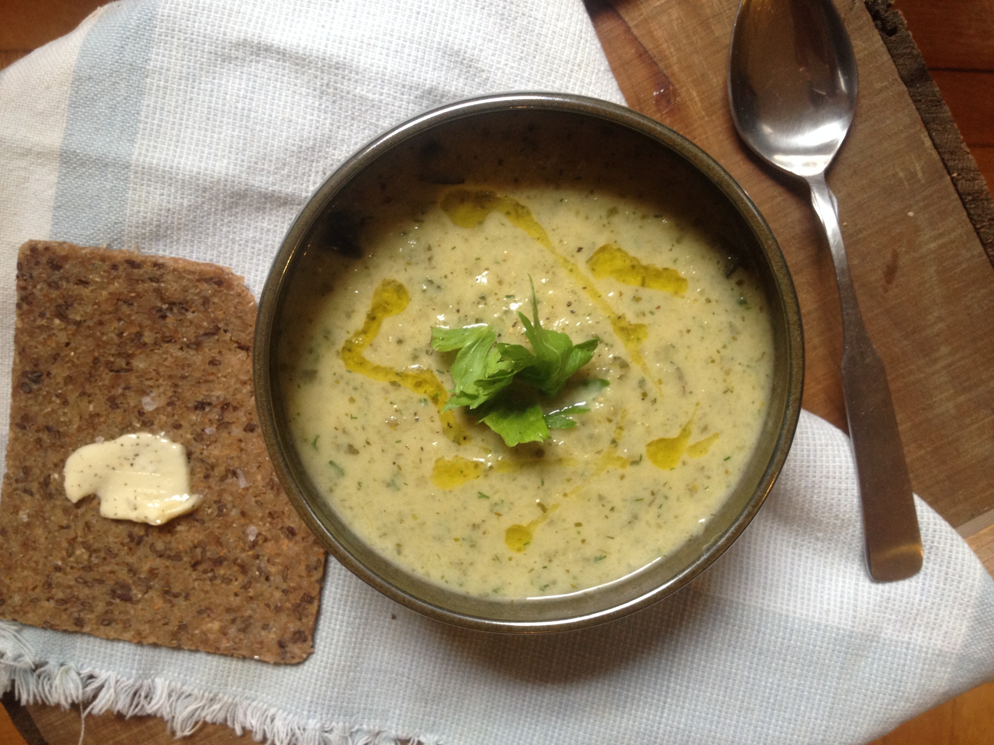 Celery seems to be having a bit of an “it” moment in food don’t you think? Featured as the main ingredient in salty spicy salads; in celery tonics; in the last episode of Breaking Bad (ok, made that up), and of course, soups everywhere. In the spirit of things celery and fall, here is a quick and dirty celery soup. Ok, not that quick, not that dirty, but pretty darn basic. Some easy substitutions could make this vegetarian and vegan lickety split (i.e., substituting vegetable broth, using coconut cream instead of half and half…) This soup is velvety, rich, and smooth. The original recipe uses whole cream instead of half and half and more butter; I reduced both, but feel free to tinker/increase, as your palate desires.